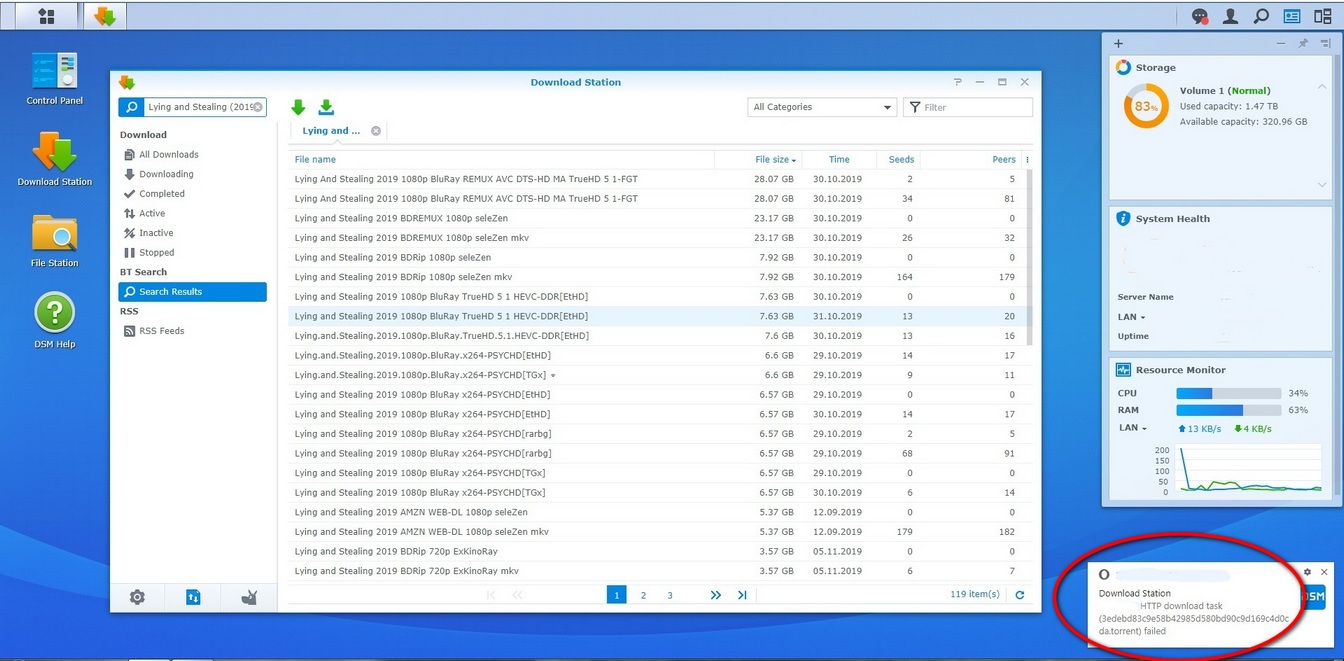 On kellelgi ideid, mis võiks põhjuseks olla, et Download Station annab kõikidele allalaadimistele pildil lisatud veateate ega alusta laadimist?