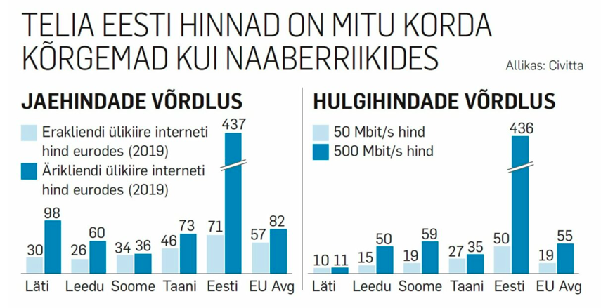 Telia Eesti tüüppakkumine 50/50 mega kiiruste juures on 22 eurot kuus. Sellise kiirusega internet on Eesti kontekstis tavakasutajale juba üle keskmise tase. Lätis ja Leedus, kus samuti on Telia turuliider, Telia nii aeglast asja enam aga ei pakugi. Küll aga võid Lätis ja Leedus saada sealse Telia käest 300megase kiiruse 14–16 euroga kuus. Põhimõtteliselt kehtib Eesti kahjuks valem „kuus korda aeglasem, aga see eest poole kallim“.