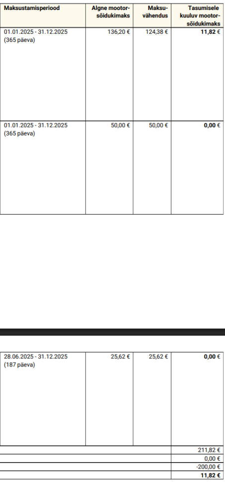 | Mõlema auto eest tagastati 25 eur, aga selle aasta nõue kahe auto eest on suurem, niiet ei võta siit miskit välja, juurde tuleb kuu lõpus maksta.
