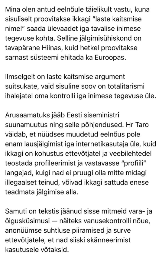 [Uuendus: Pärast proteste selgus 13. novembril, et vestluse kontroll ei tohiks olla kohustuslik, isegi mitte „riski maandamise” tagaukse kaudu. Teised probleemid aga püsivad. Peame oma häält tõstma eelseisvatel kolmepoolsetel läbirääkimistel Euroopa Parlamendi, ELi valitsuste ja Euroopa Komisjoni vahel. Need peaksid algama jaanuaris 2026 ja lõppema märtsiks.]