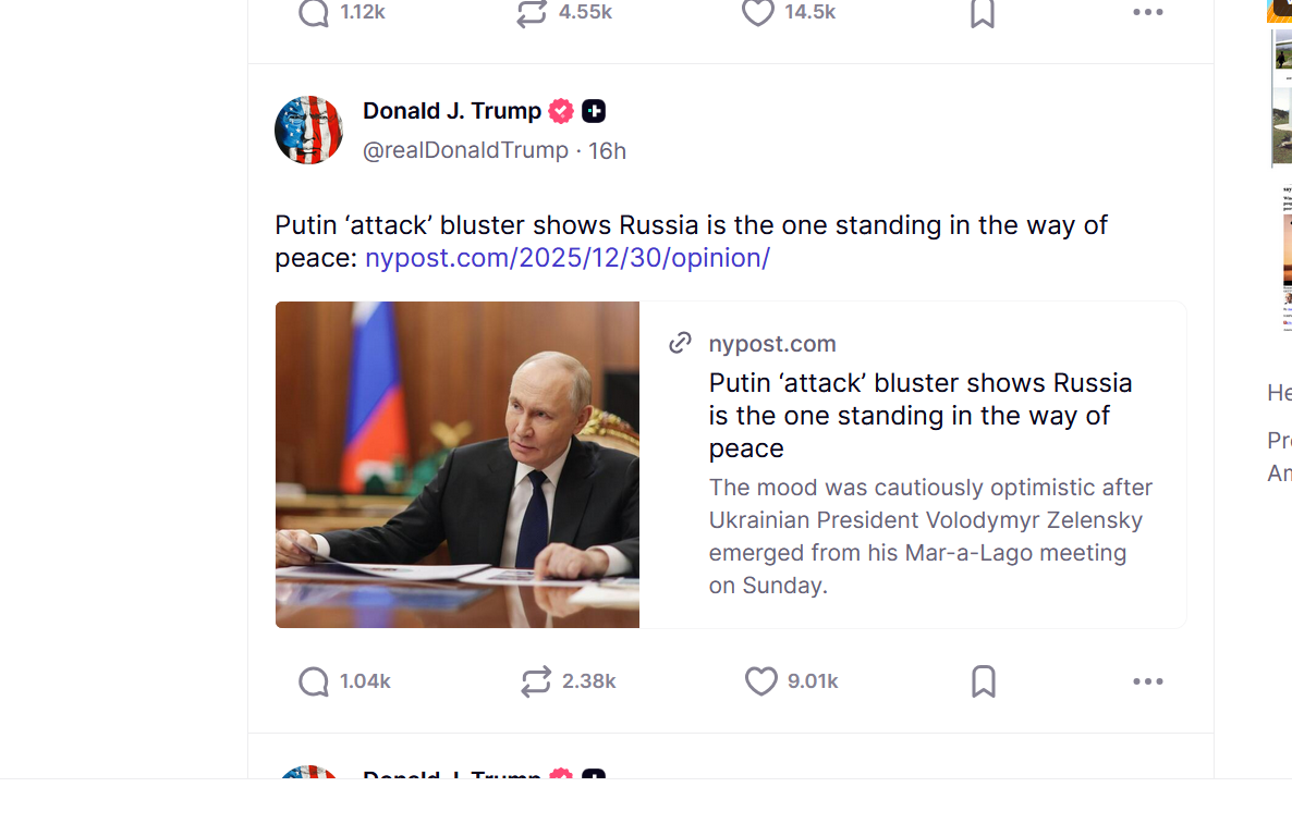 | CIA teatas aga Trumpile peale tema kommentaari, et tõenäoliselt ei ole Venemaa väide rünnaku kohta tõene, mistõttu võttis Trump koheselt skeptilisema hoiaku. Ta jagas oma sotsiaalmeedias New York Posti artiklit, mille toimetus kritiseeris teravalt Putinit ja tema ligi neli aastat kestnud sõda Ukraina vastu. |