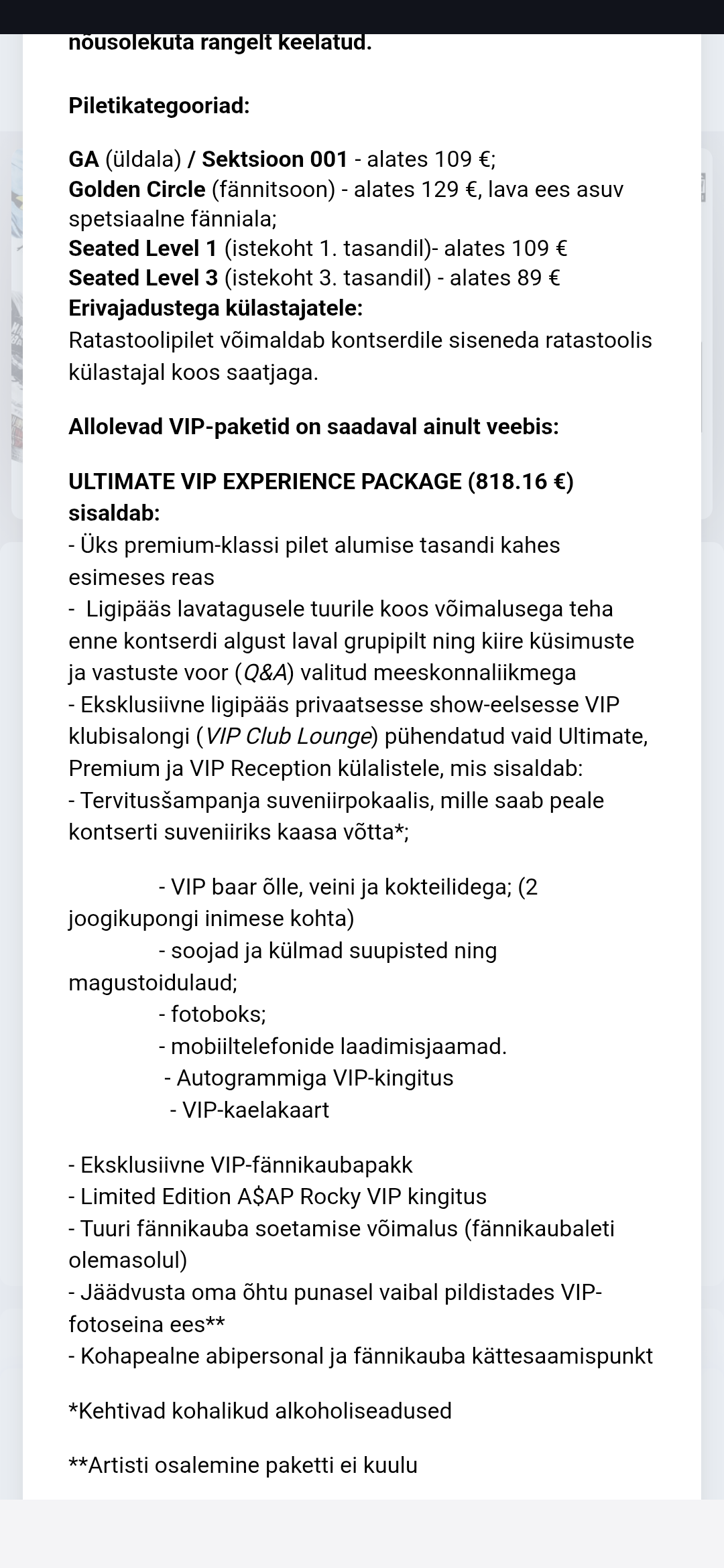 VIP baar kahe joogikupongiga ja mobiili laadimise võimalus, artisti osalemine paketti ei kuulu