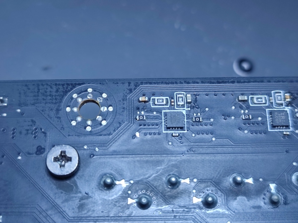On ka küsitud, et näita mis remonditud on. Ega seal väga midagi vaadata pole. Korpuse emaplaadi standoffiga on kruviaugu ümbert löödud mõned SMD komponendid minema. Antud näite puhul üks konde ja 0ohm takisti. Mõnel plaadil on rohkem seal piirkonnas kahju tehtud. Mõnel vahetatud doubler ja selle faasi mosfet.