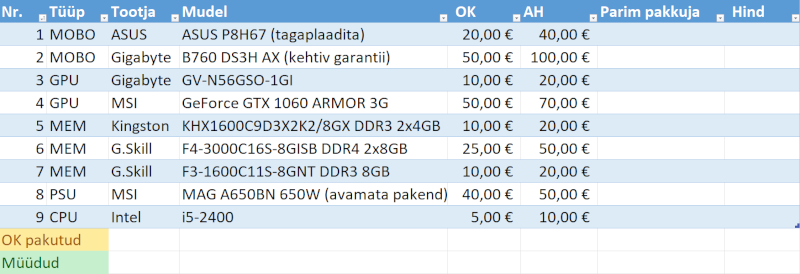 * Võid teha ka alla alghinna (AH) pakkumisi — vaatan lõpus, kas liigub või ei.