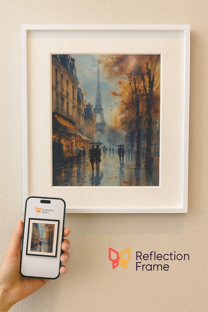 Digitaalsed pildiraamid on turul juba aastakümneid. Märksõnadeks: WIFI, pilv, slideshow, juhtmed, laadimine, helendav LCD-paneel. Kuid kõik see ei pea enam nii olema ja siin tuleb mängu värviline e-paber (E-Ink). Sama põhimõte, mida teame e-lugeritest, ainult et nüüd kunstina seinal. Kui digiraam oli seni eelkõige järjekordne “tehnikavidin” kapi peal, siis uue tehnoloogiaga Reflection Frame raami puhul on tähelepanu keskmes pilt ise.