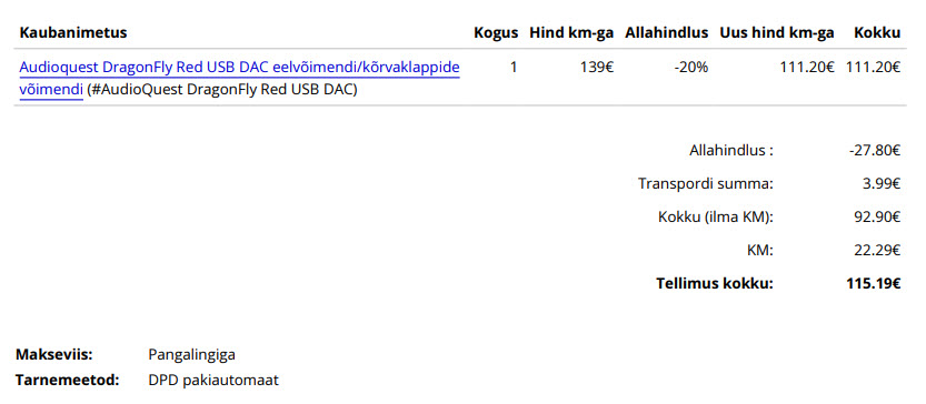 ronny25, tänud vihje eest. Nädal tagasi võtsin Valiheliga ühendust ja küsisin, kas musta reede puhul saaks DragonFly Black hinda soodsamaks. Ootan homse ära ja kui mingit soodukat ei tule, siis ostan vist samuti punase Noorest Tehnikust. Audiotehnikas kah sama hind - https://audiotehnika.ee/audioquest-dragonfly-red-usb-dac/