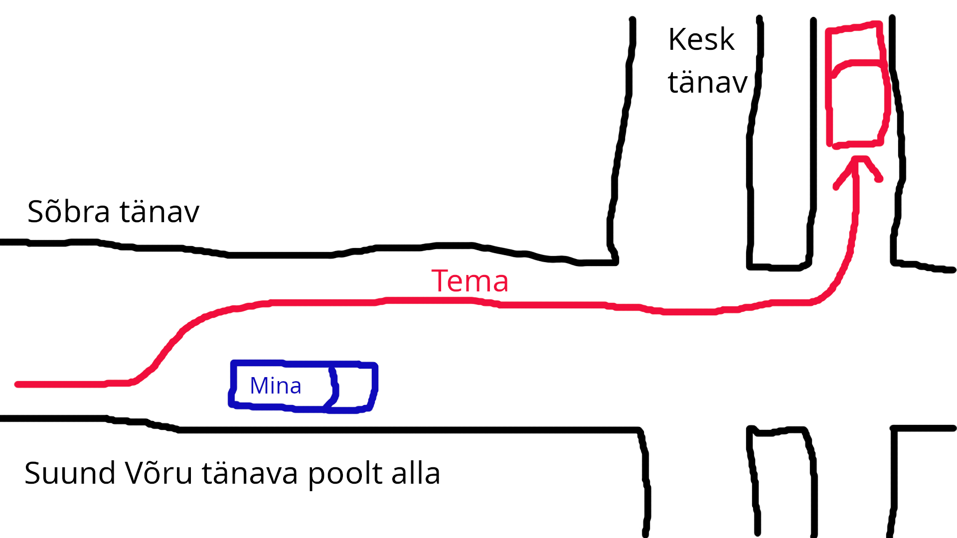 Tulin mööda Sõbrat alla, kiirus nagu peab, 30. Veidi maad enne Sõbra-Kesk ristmikku üks "Tähtis Tegelane" kimas minust mööda ja sealt vastassuunast keeras üsna suurel kiirusel vasakule Kesk tänavale. Ta ei peatunud, et ringi vaadata (seal on parema käe reegel). Tal oli ruumi, et mu ees tagasi reastuda, aga ta ei teinud seda.