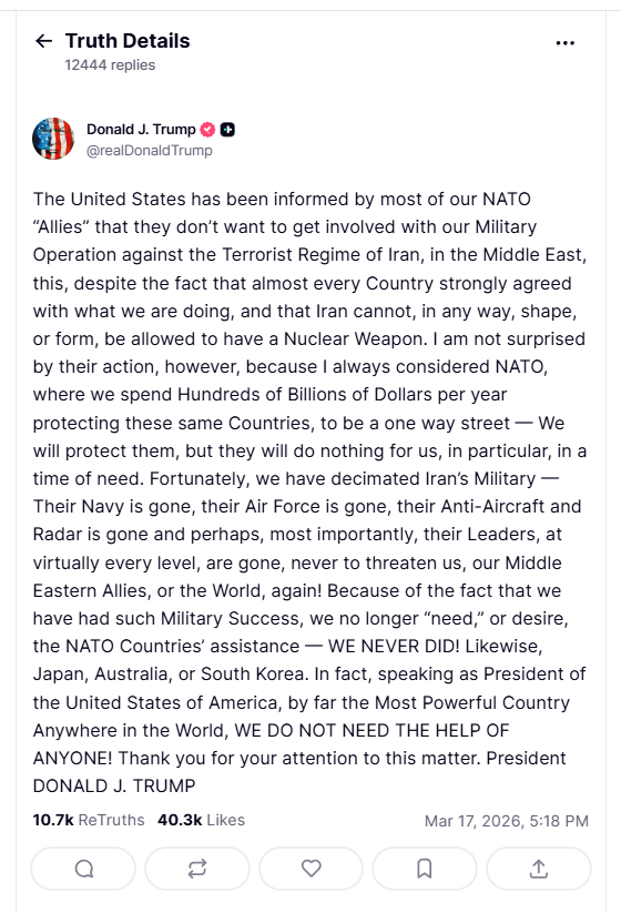 Finland’s President Alexander Stubb said NATO allies have to take Donald Trump at his word when the US president puts the future of the alliance on the line to safeguard passage through the Strait of Hormuz.