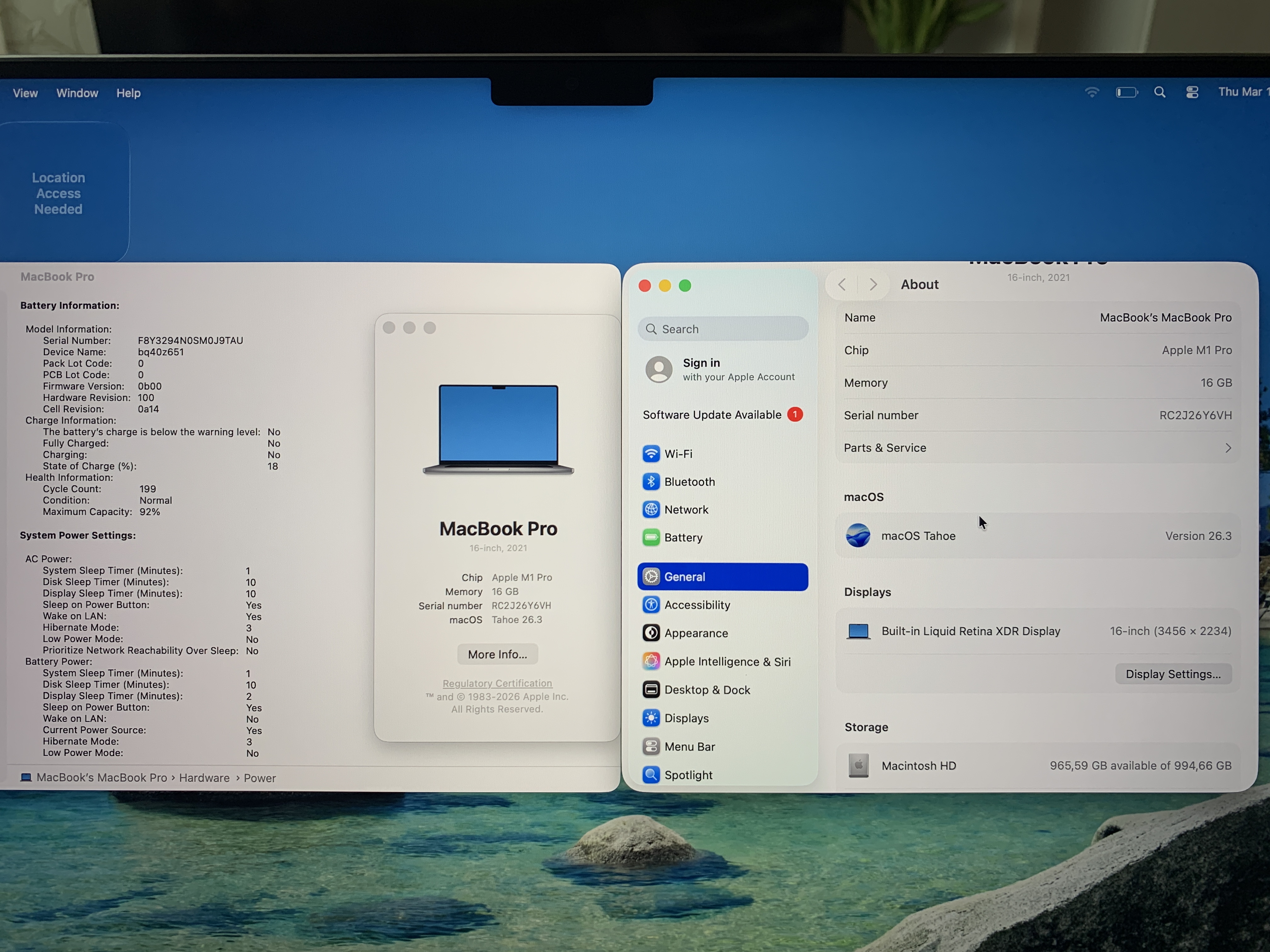 Kõik andmed on piltidel välja toodud: M1 Pro kiibistik, 16GB RAMi, 1TB salvestusruumi, battery health 92% 199 laadimistsükliga.