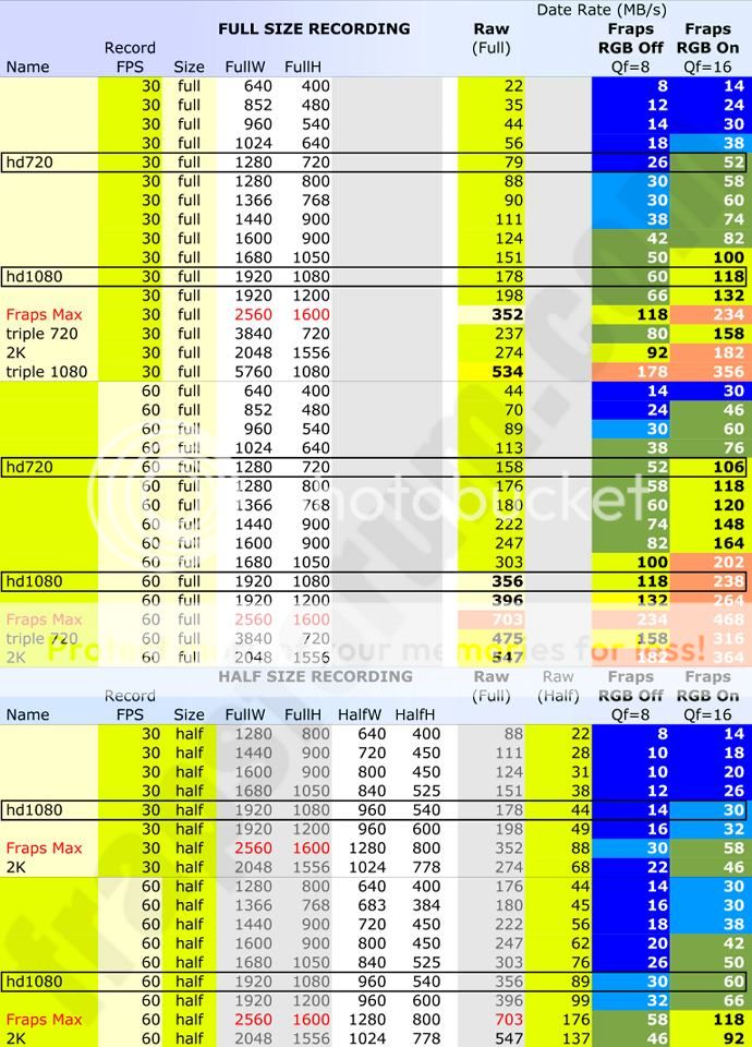 Anyone with a well-tuned 7200 RPM, 750GB+ dedicated HDD should be able to record at any data rate marked in blue or green. Yellow will need a high performance drive, and red will most likely require RAID.