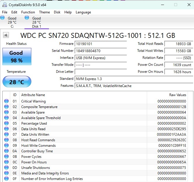 WDC SN730 256GB (health 93%)
